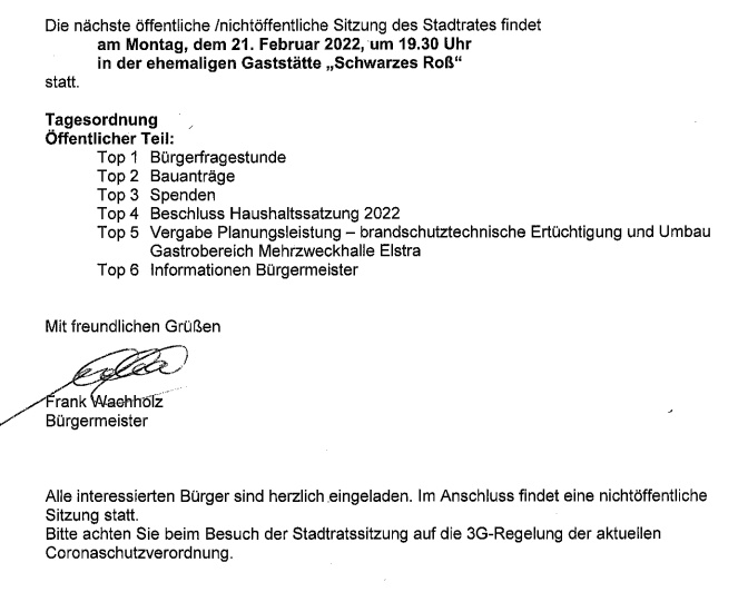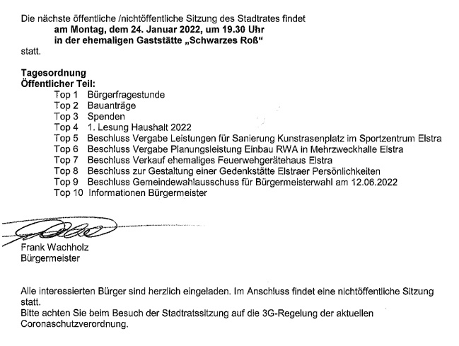 Alle interessierten Bürger sind herzlich eingeladen. Im Anschluss findet eine nichtöffentliche Sitzung statt.